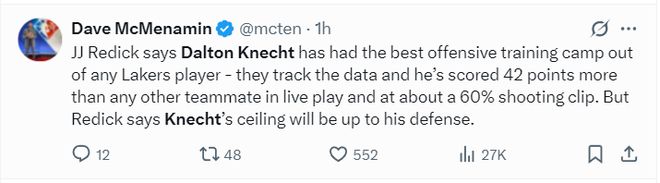 赛后雷迪克这样评价克内克特:在所有的湖人球员中,克内克特实际上是训练营进攻表现最出色的选手,球队又数据追踪,他在实战中得分比其他队友多42分,投篮命中率约60%,不过他的防守才是提升他上限的关键。