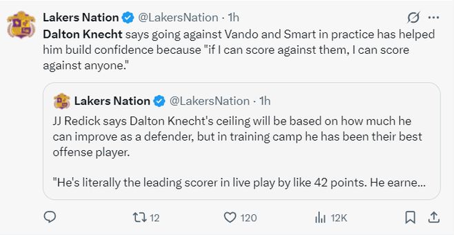 北京时间10月13日,湖人击败勇士的季前赛,道尔顿-克内克特是先发二号位,这场比赛克内克特一扫阴霾得分上双,此前两场比赛克内克特合计21中5+三分14中3,他甚至被多支球队视为负资产,不少GM认为湖人送走他需要搭上一些优质资产才行。